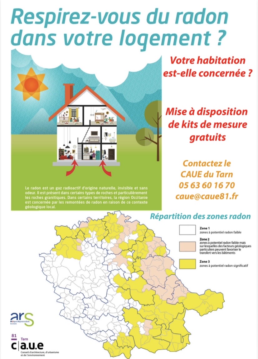 L’ARS - Agence Régionale de Santé - a missionné le CAUE du Tarn (Conseil d’Architecture d’Urbanisme et d’Environnement) pour mener une campagne de mesure du gaz RADON pour l’hiver 2025 / 2026, chez les particuliers volontaires situés sur des communes classées en zone 3 (zones à potentiel radon significatif).